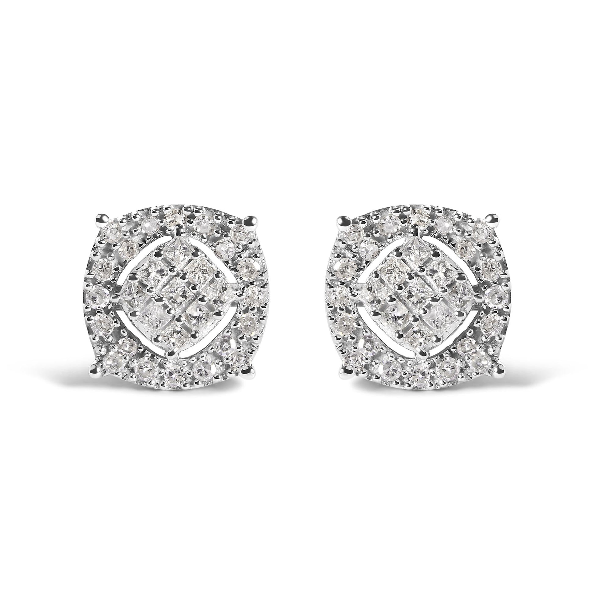 Immerse yourself in the timeless elegance of these 10K white gold stud earrings, rhodium-plated for an extraordinary luster that captures the light with every turn. At the heart of each cushion-shaped piece, nine princess-cut natural diamonds come together in a dazzling composite, mesmerizing with their collective brilliance. Encircling this captivating center, a halo of round white diamonds sparkles intensely, their clarity graded I-J in color and I1-I2, reflecting a ballet of shimmering light. The practical yet stylish push-back closure ensures these treasures remain securely adorned, adding a whisper of luxury to both everyday fare and exquisite evening wear. Perfect for those who appreciate fine craftsmanship and the intimate allure that only diamonds can provide.