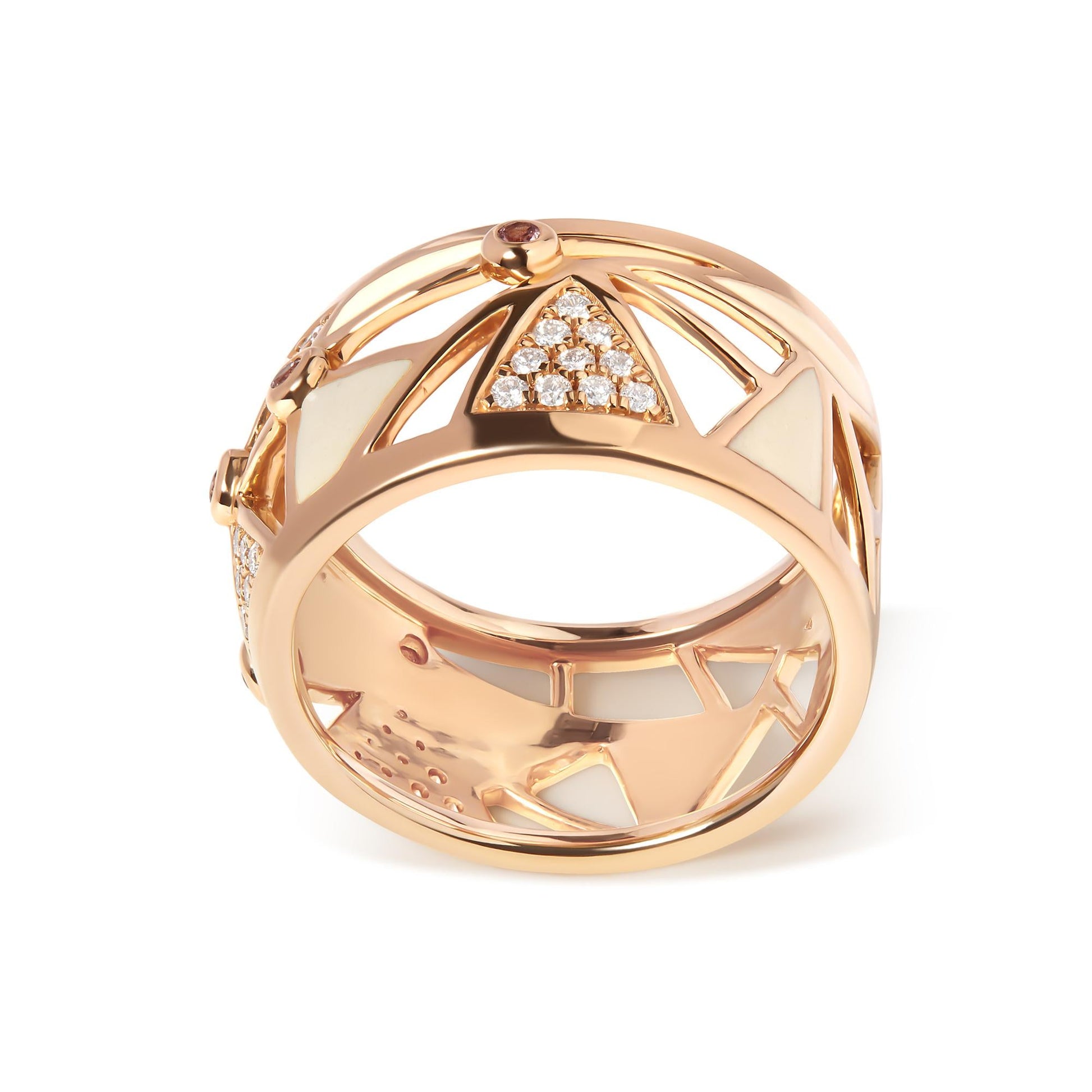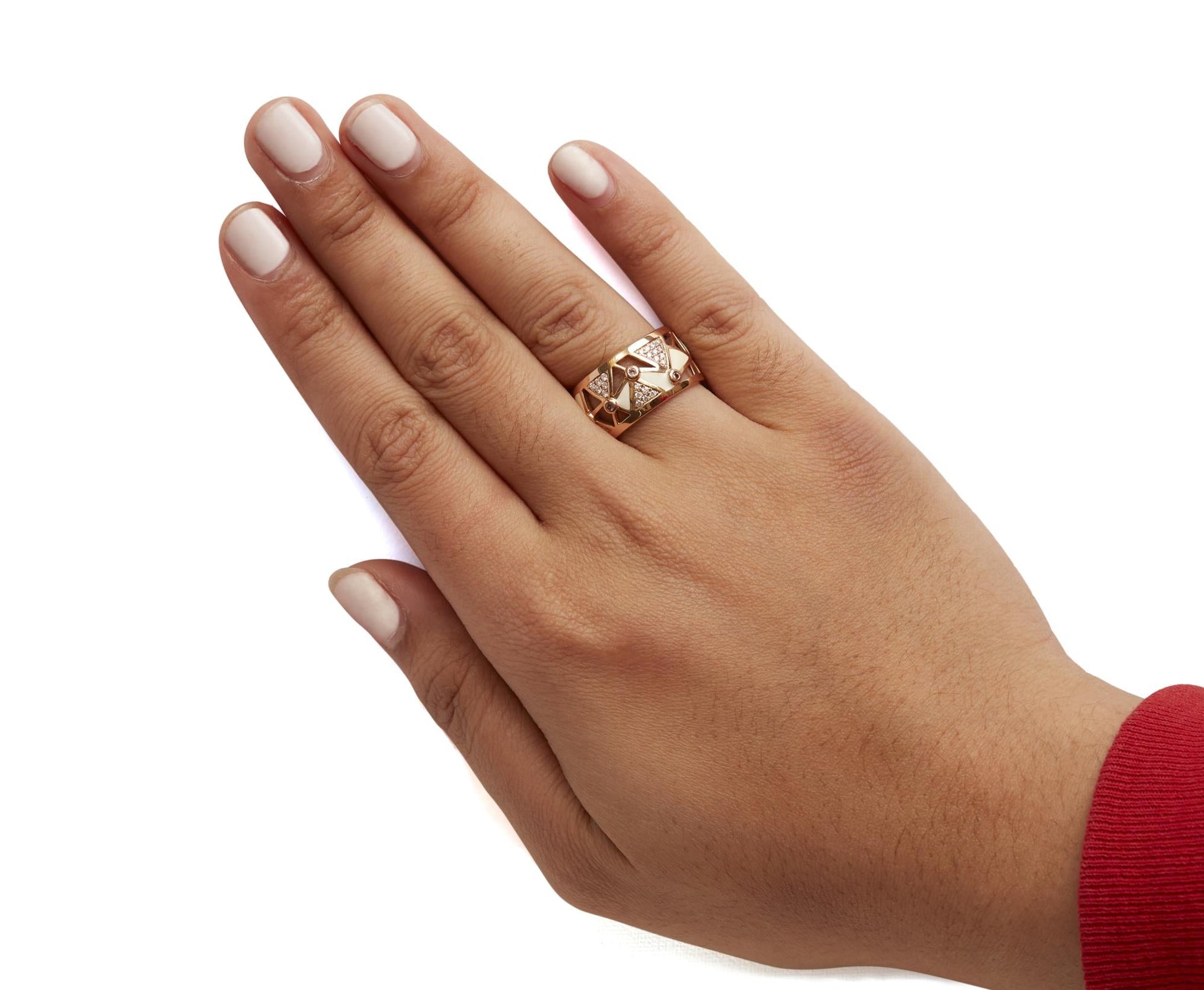 Indulge in the elegance of the 14K Rose Gold Diamond and Pink Tourmaline Cigar Band Ring, where modern design meets classic allure. With an opulent wide band of rose gold, highlighted by 1/3 Cttw of diamonds with a shimmering G-H color and SI1-SI2 clarity, this ring casts a spell of luxury on every gesture. At the heart of the piece, five lab-created pink tourmalines, splendid in their vivid hues enhanced by careful color treatment, dazzle amidst the geometric splendor of white enamel cutouts. Each 5x5 mm tourmaline is a masterpiece of round cut precision, reflecting a passion for both beauty and craftsmanship. This exquisite creation is not just a ring; it's a testament to sophisticated taste and a beacon of personal expression.