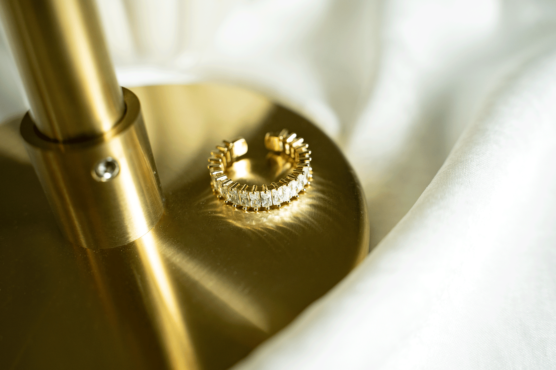 Treat yourself to our Athena Ring, thoughtfully designed with 18K gold plated stainless steel using only hypoallergenic and waterproof materials. Glistening baguette stones prong set in an eternity gives this ring a luxurious style. This ring easily adjusts to your ring size, perfectly complementing a stacked ring collection on any finger.
