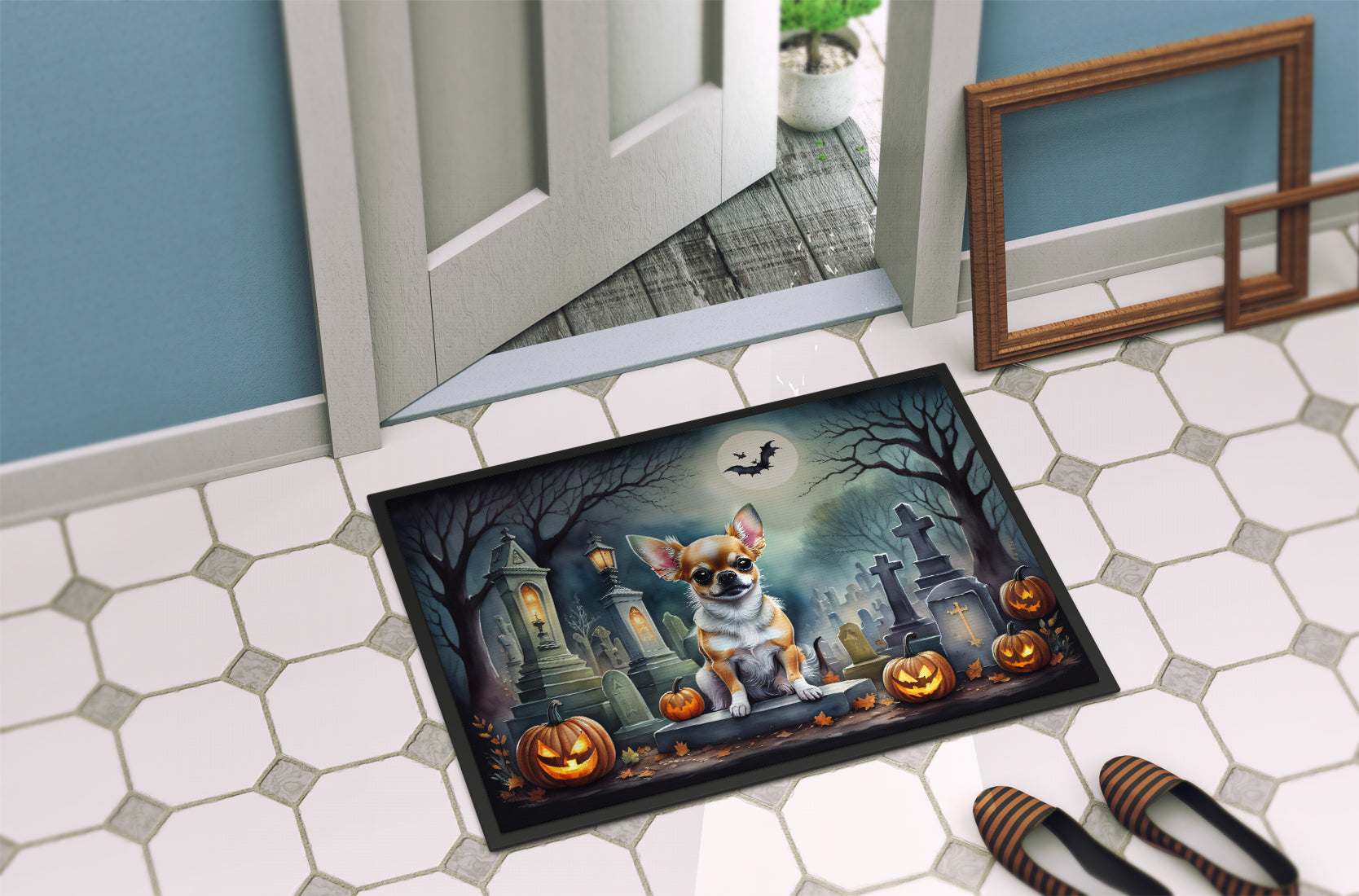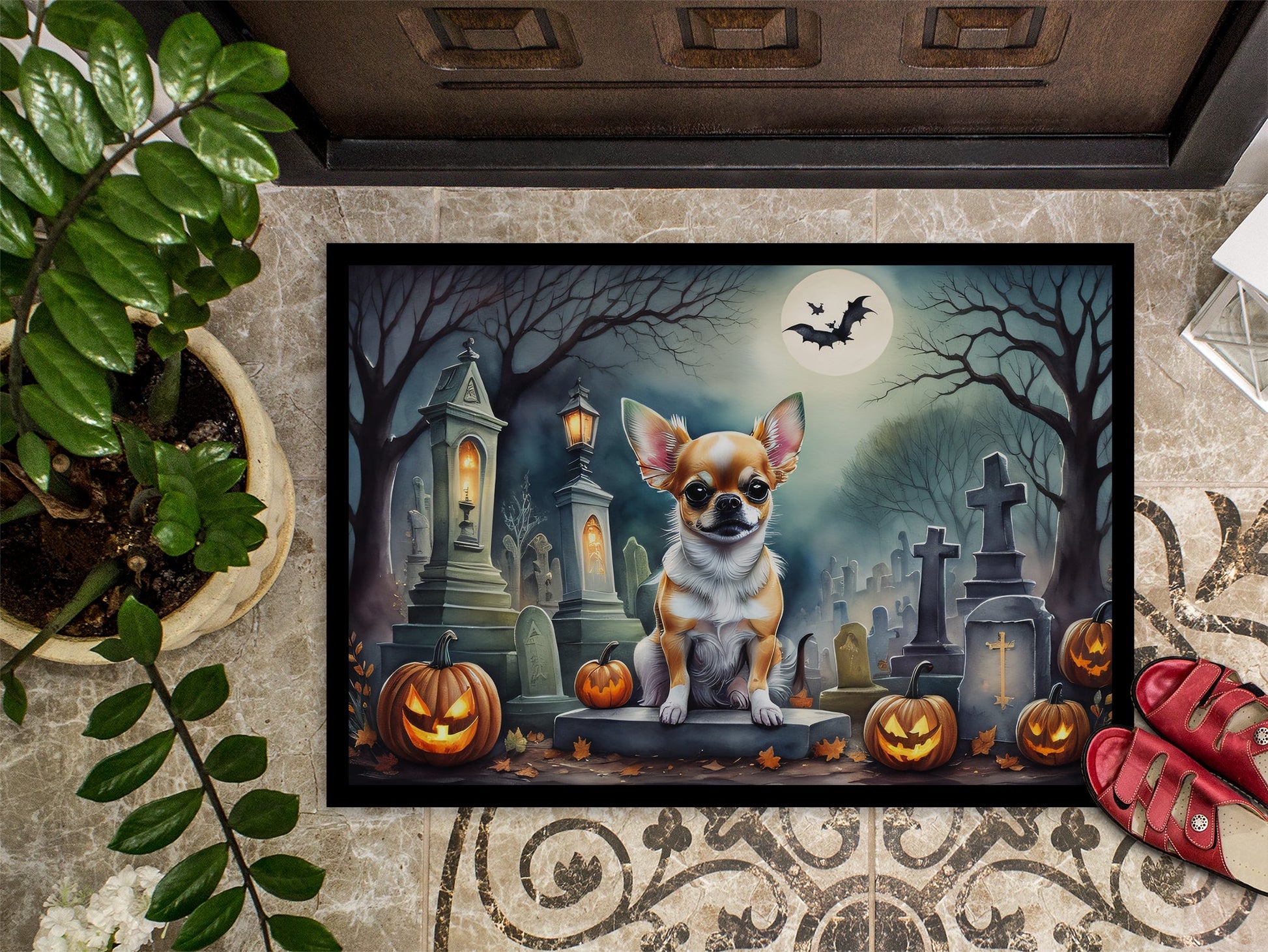Doormat featuring breed specific Chihuahua artwork. Celebrate Halloween with this Halloween Doormat. Welcome your guests in style with our Artwork Door Mat, designed to withstand almost any weather condition. This mat, measuring approximately 18 by 27 inches, is held together by durable black binding tape. Its top layer, composed of polyester felt, is dyed with the eye-catching image you see on the mat. A few layers below provide the mat with stability, while its rubber bottom is stamped to help prevent slipping and ensures safety. Our mat works wonderfully as both an indoor or outdoor door mat. For cleaning, simply hose it off with water or use a power washer - no need for any cleaner that produces suds. Avoid scrubbing with a brush, instead, opt for the vacuum on floor setting. Designed manufactured and printed in the USA, this mat is a perfect addition to your porch, outdoor kitchen, entryway, or any indoor space. Its unique design makes it a charming decorative rug that greets your guests and adds a stylish touch to your home decor.