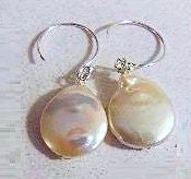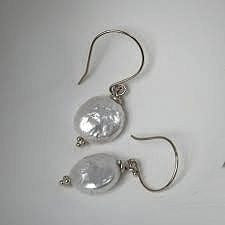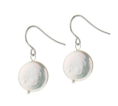 White coin pearl earrings on silver. These are a bit smaller than a dime, and a minimalist design: just the beauty of the pearls
