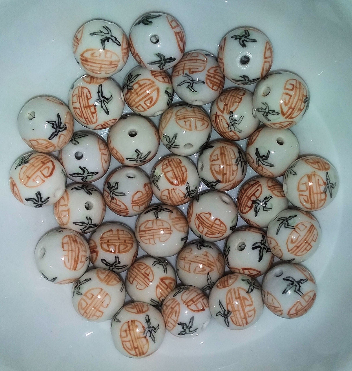The bead is Peking glass or porcelain from the late 19th or early 20th century. The character in writing means "Double Happiness" and refers to marriage. The bird represents longevity. The two combined represent the power to bring a long and happy life and marriage.