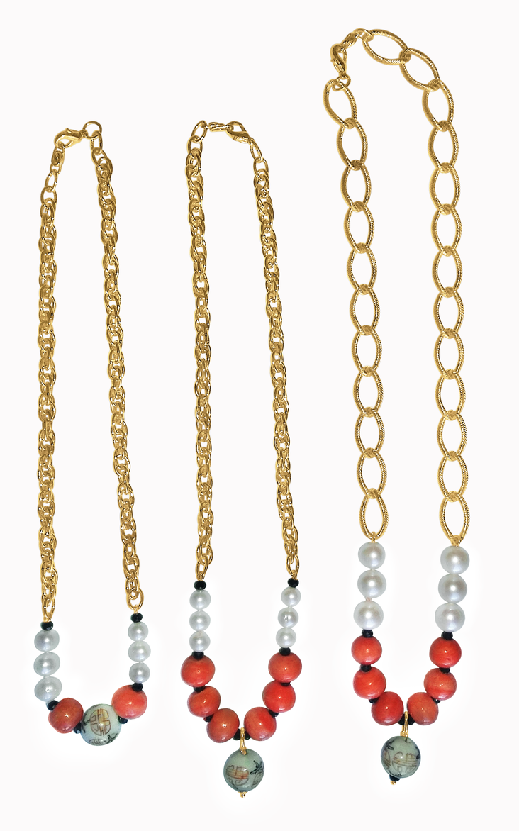 Double Happiness, Happy Marriage, Longevity, Coral Asian Glass Beads, Pearls on Bold Gold Chain Necklace: 18K Plate