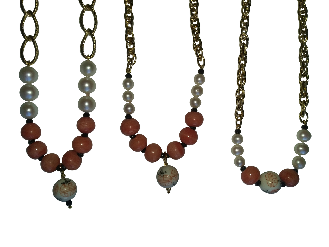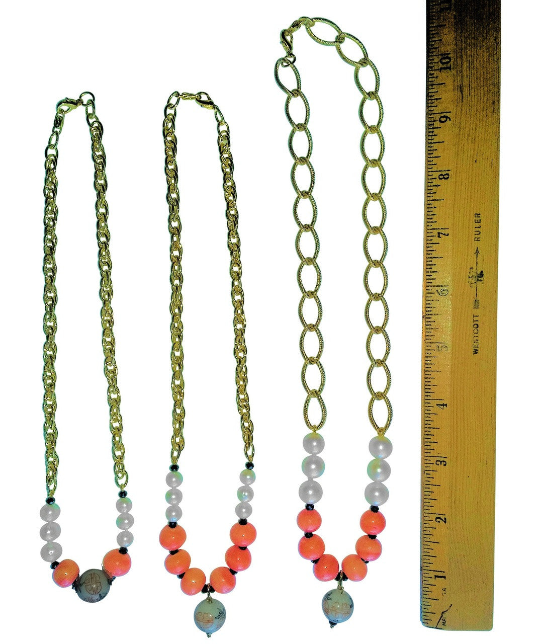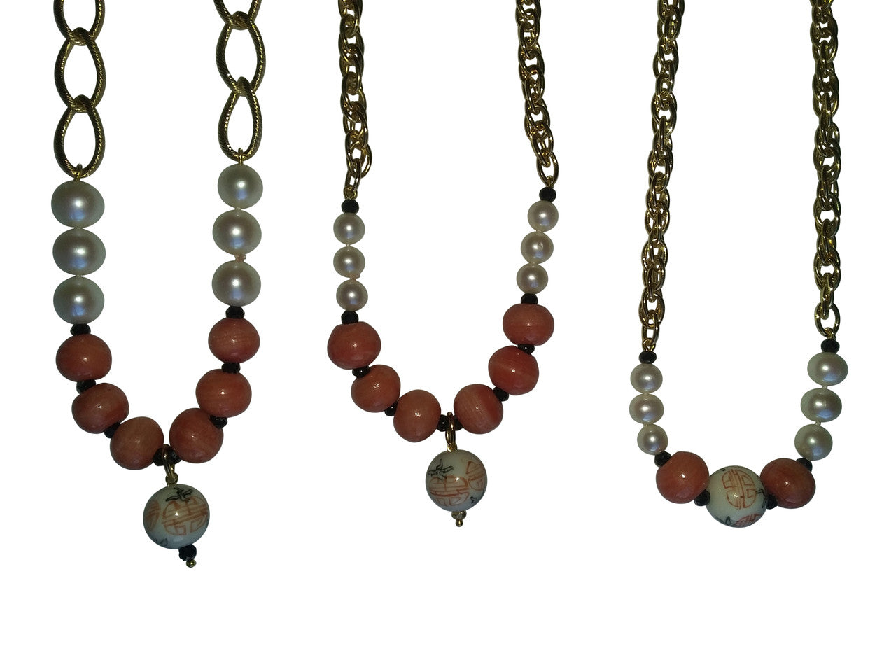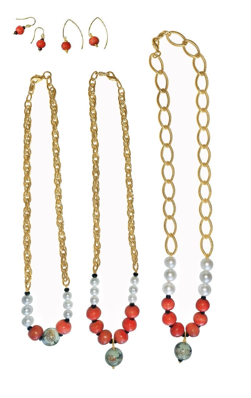 Straight Design Center Chinese Bead, Coral Beads, Medium Pearls blending into Thinner, Denser Chain: 17.5""