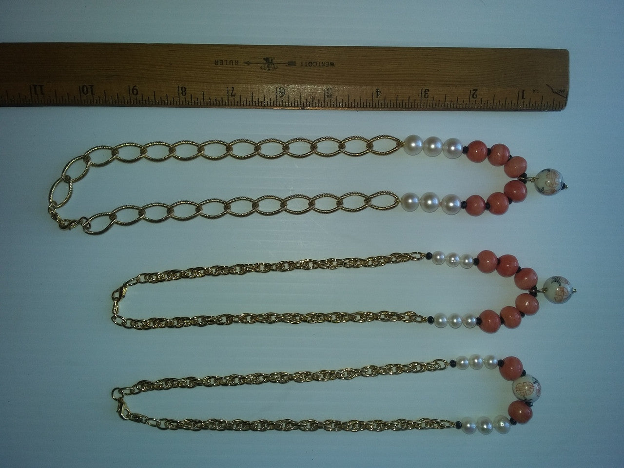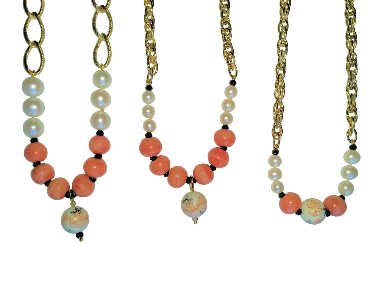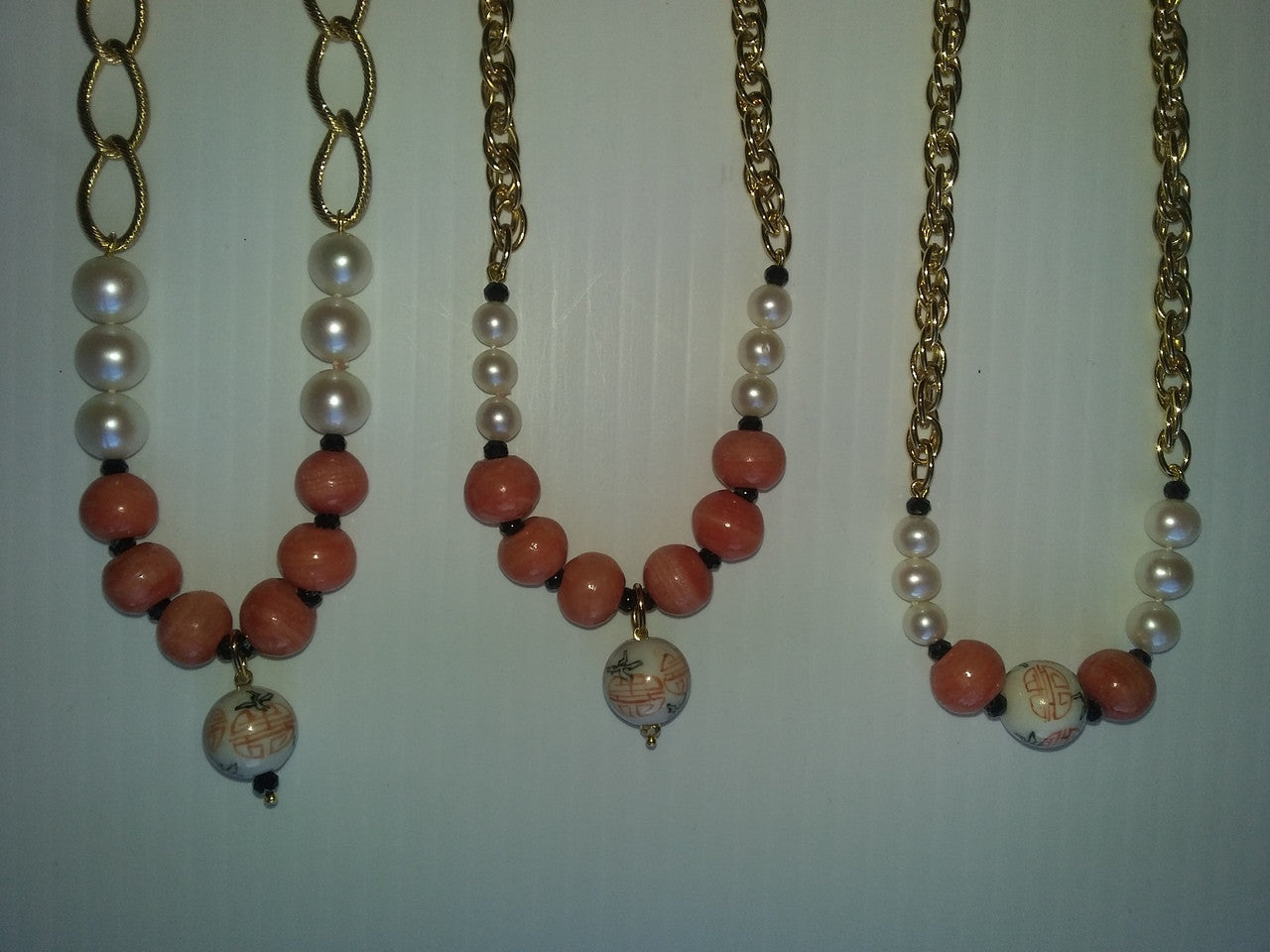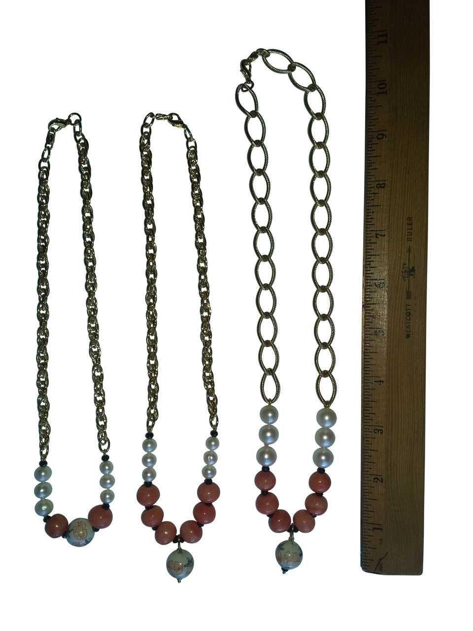 Straight Design Center Chinese Bead, Coral Beads, Medium Pearls blending into Thinner, Denser Chain: 17.5""