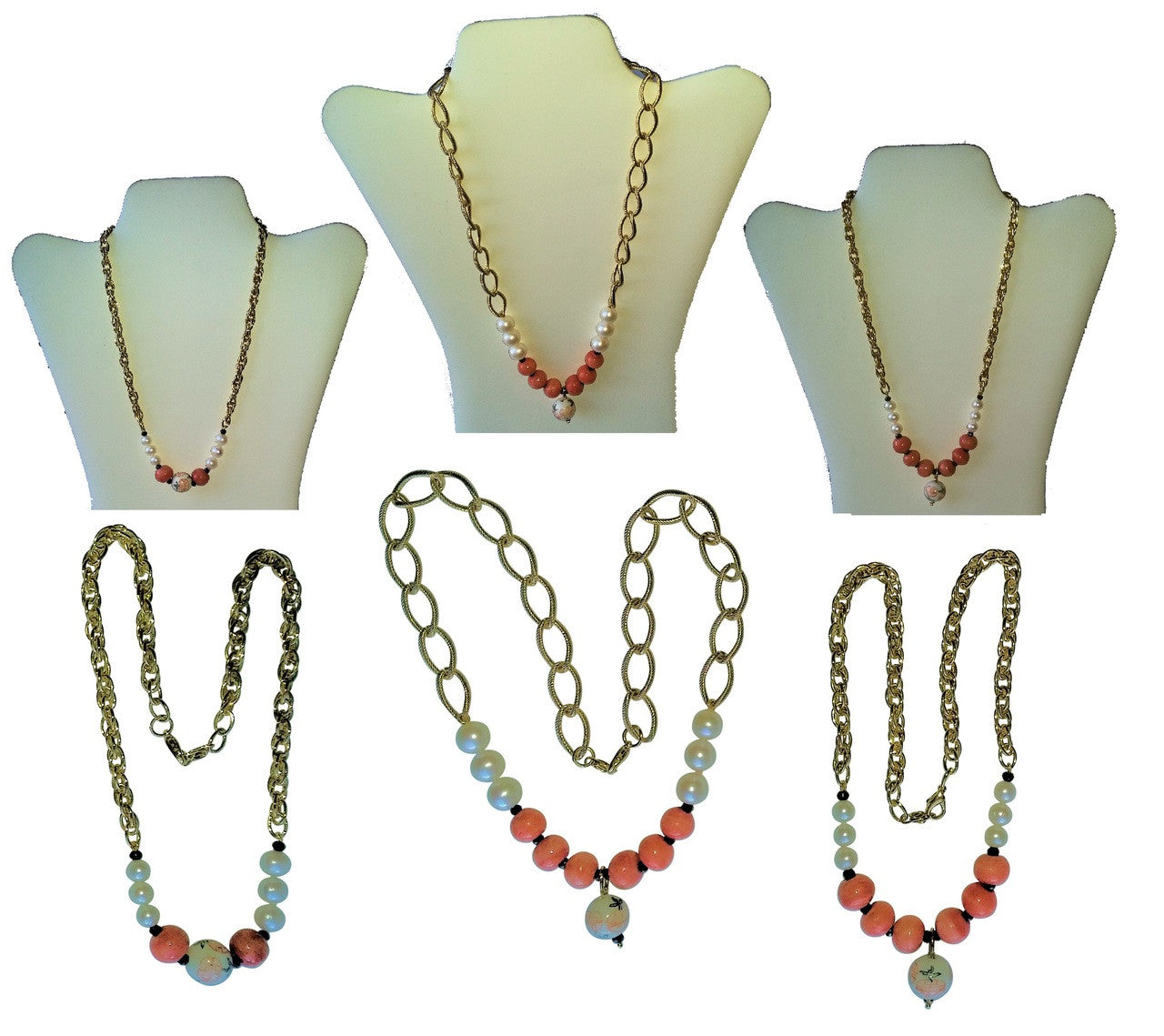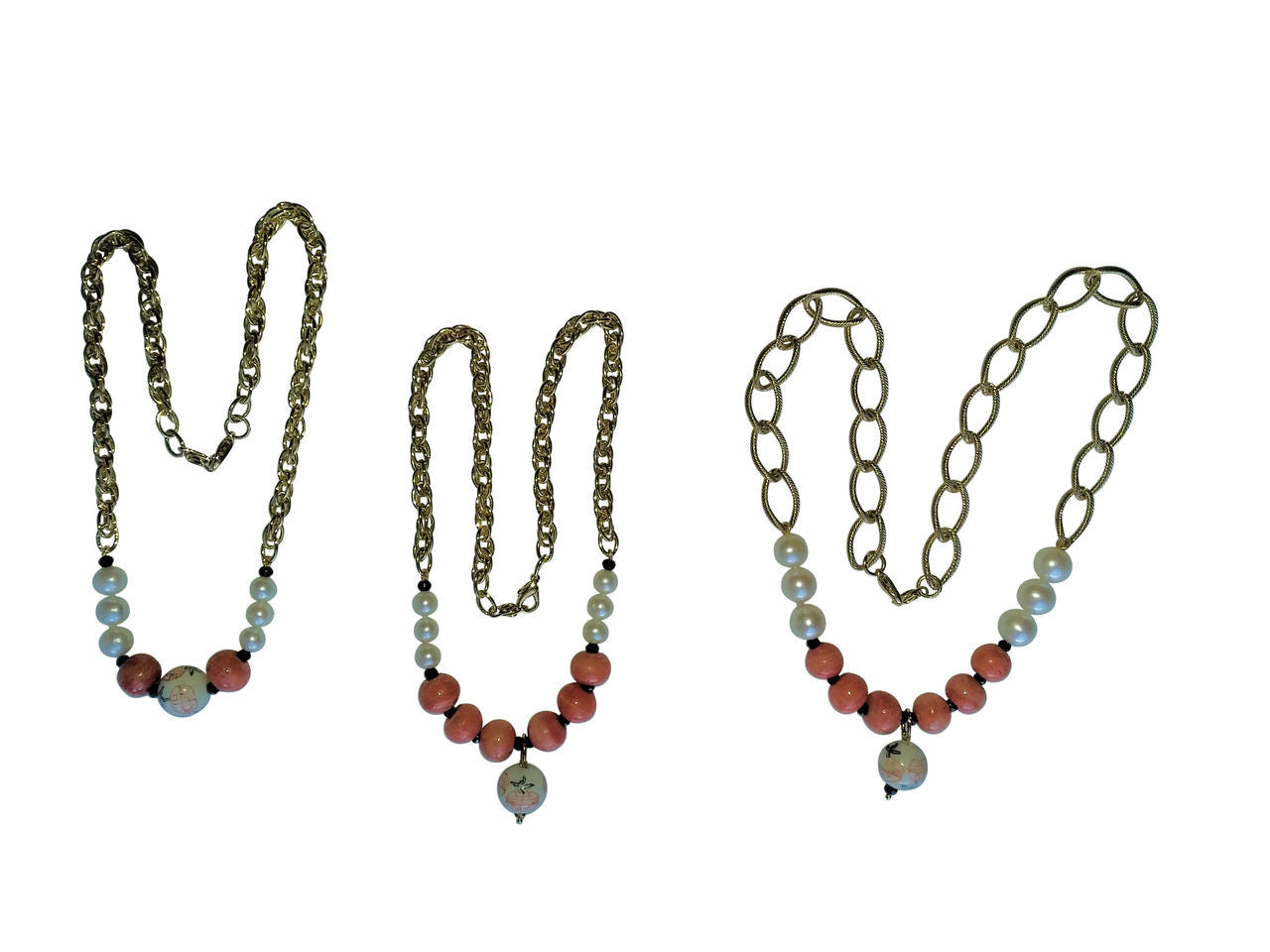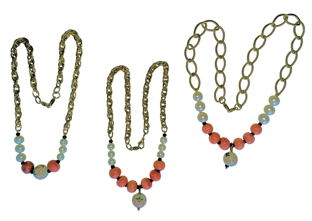 Drop Center Chinese Bead, Coral Beads, Medium Pearls, blending into Thinner, Denser Chain: 18"