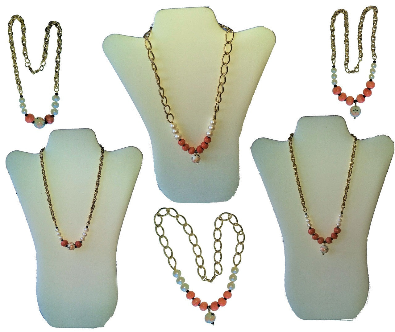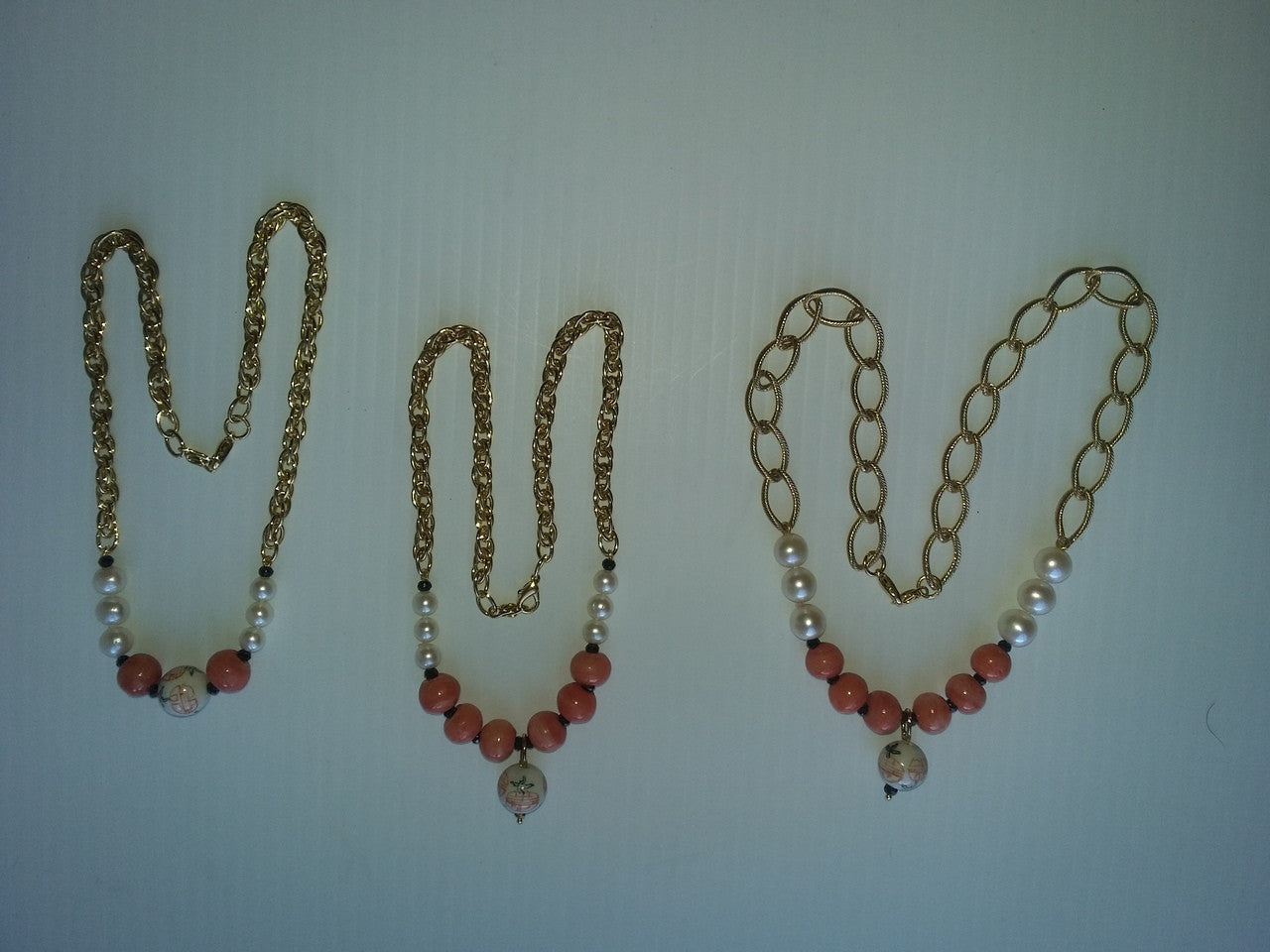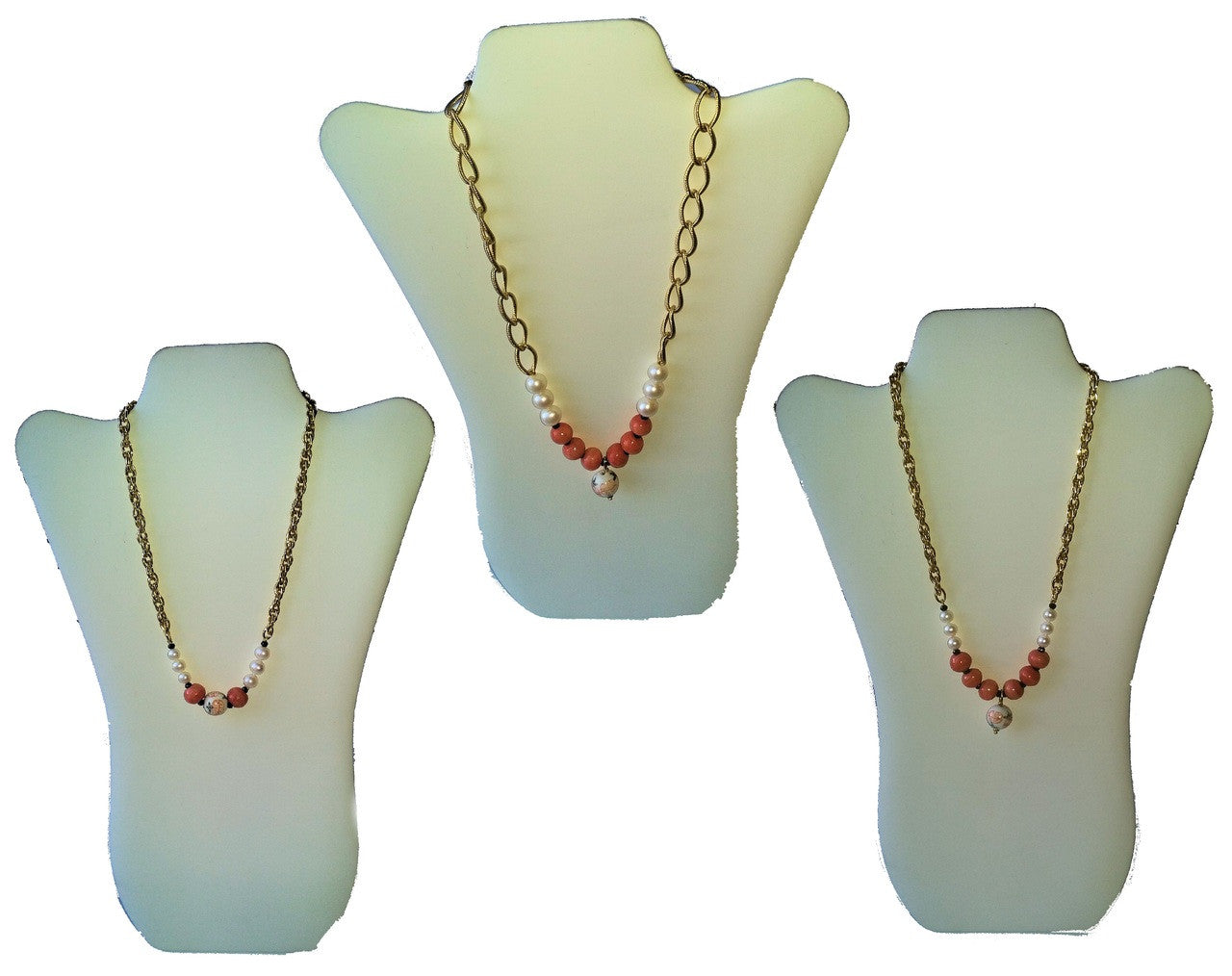 Drop Center Chinese Bead, Coral Beads, Medium Pearls, blending into Thinner, Denser Chain: 18"