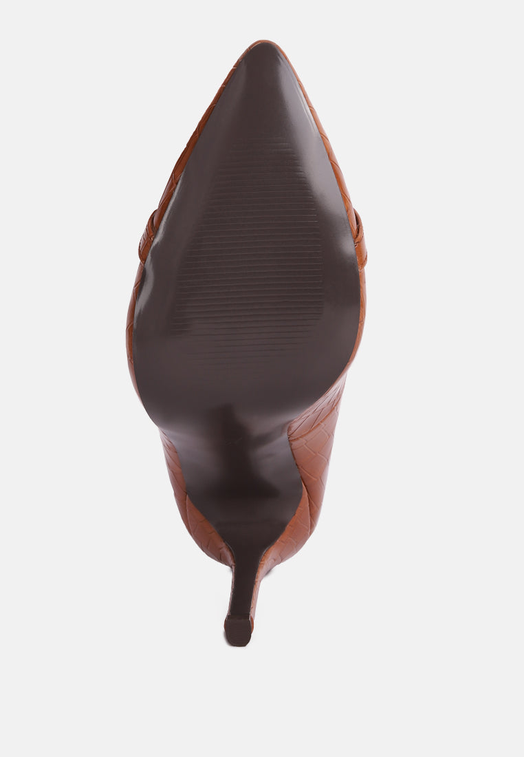 Fan of Croc textured stiletto pumps? Look no further than the stiletto sandals with link embellishment for the glam and light cushion insole for comfort. Wear the semi-casual style footwear with formal or after work when the party hour strikes!