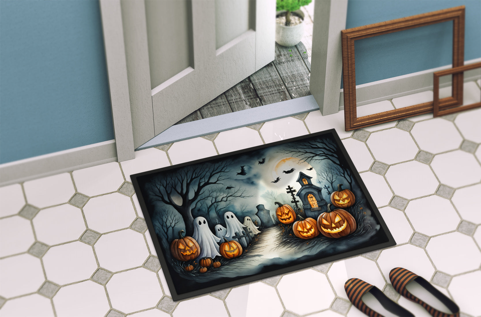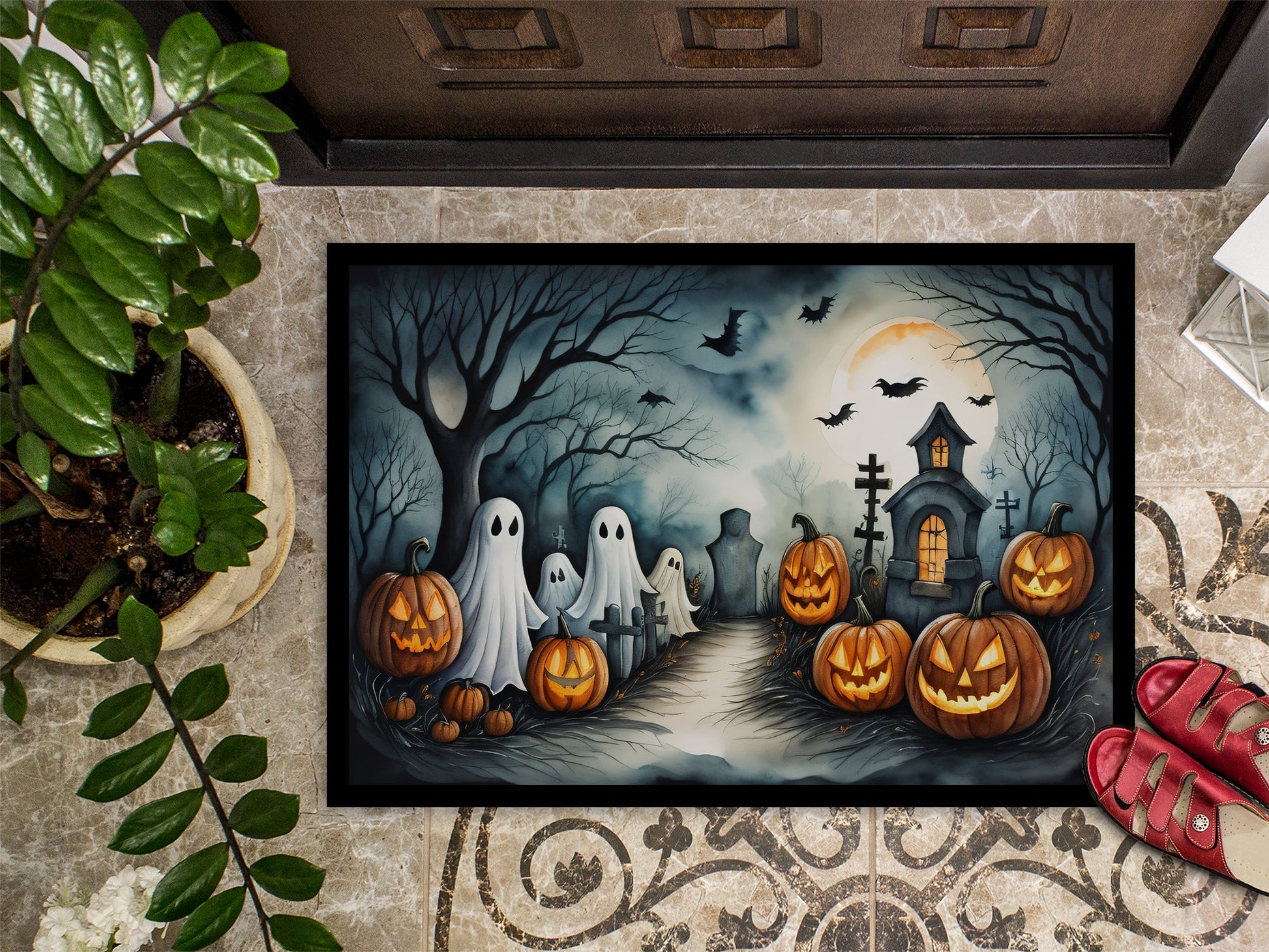 Celebrate Halloween with this Halloween Doormat. Welcome your guests in style with our Artwork Door Mat, designed to withstand almost any weather condition. This mat, measuring approximately 24 by 36 inches, is held together by durable black binding tape. Its top layer, composed of polyester felt, is dyed with the eye-catching image you see on the mat. A few layers below provide the mat with stability, while its rubber bottom is stamped to help prevent slipping and ensures safety. Our mat works wonderfully as both an indoor or outdoor door mat. For cleaning, simply hose it off with water or use a power washer - no need for any cleaner that produces suds. Avoid scrubbing with a brush, instead, opt for the vacuum on floor setting. Designed manufactured and printed in the USA, this mat is a perfect addition to your porch, outdoor kitchen, entryway, or any indoor space. Its unique design makes it a charming decorative rug that greets your guests and adds a stylish touch to your home decor.