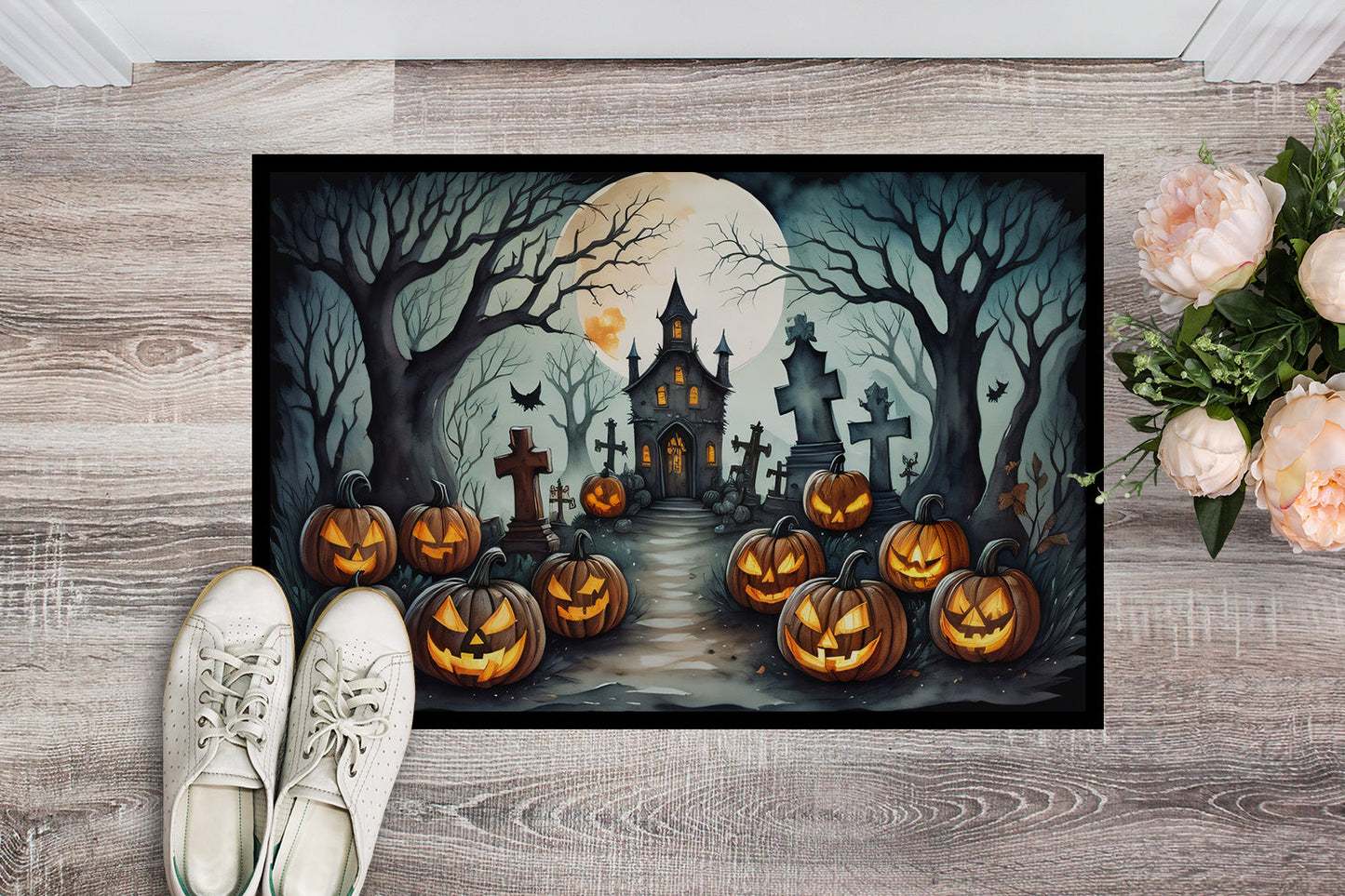 Celebrate Halloween with this Halloween Doormat. Welcome your guests in style with our Artwork Door Mat, designed to withstand almost any weather condition. This mat, measuring approximately 18 by 27 inches, is held together by durable black binding tape. Its top layer, composed of polyester felt, is dyed with the eye-catching image you see on the mat. A few layers below provide the mat with stability, while its rubber bottom is stamped to help prevent slipping and ensures safety. Our mat works wonderfully as both an indoor or outdoor door mat. For cleaning, simply hose it off with water or use a power washer - no need for any cleaner that produces suds. Avoid scrubbing with a brush, instead, opt for the vacuum on floor setting. Designed manufactured and printed in the USA, this mat is a perfect addition to your porch, outdoor kitchen, entryway, or any indoor space. Its unique design makes it a charming decorative rug that greets your guests and adds a stylish touch to your home decor.