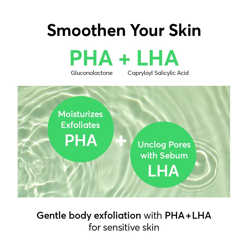 A mildly acidic body mist that removes dead skin cells and unclogs pores to