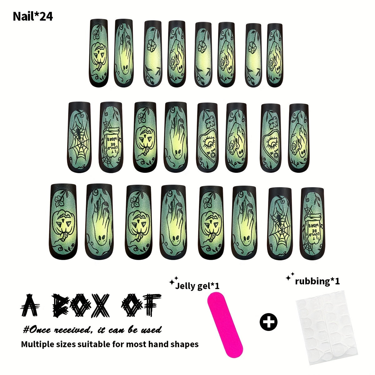 Elevate your style this Halloween season with our stunning 24 Pcs Long Square Halloween Nail Tips Set. Featuring a unique blend of black and green matte finishes, these full-cover artificial nails are perfect for any festive occasion or everyday wear.