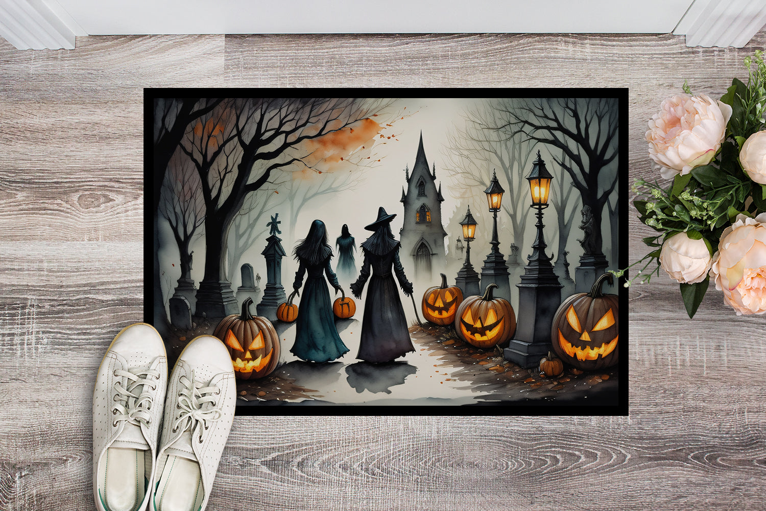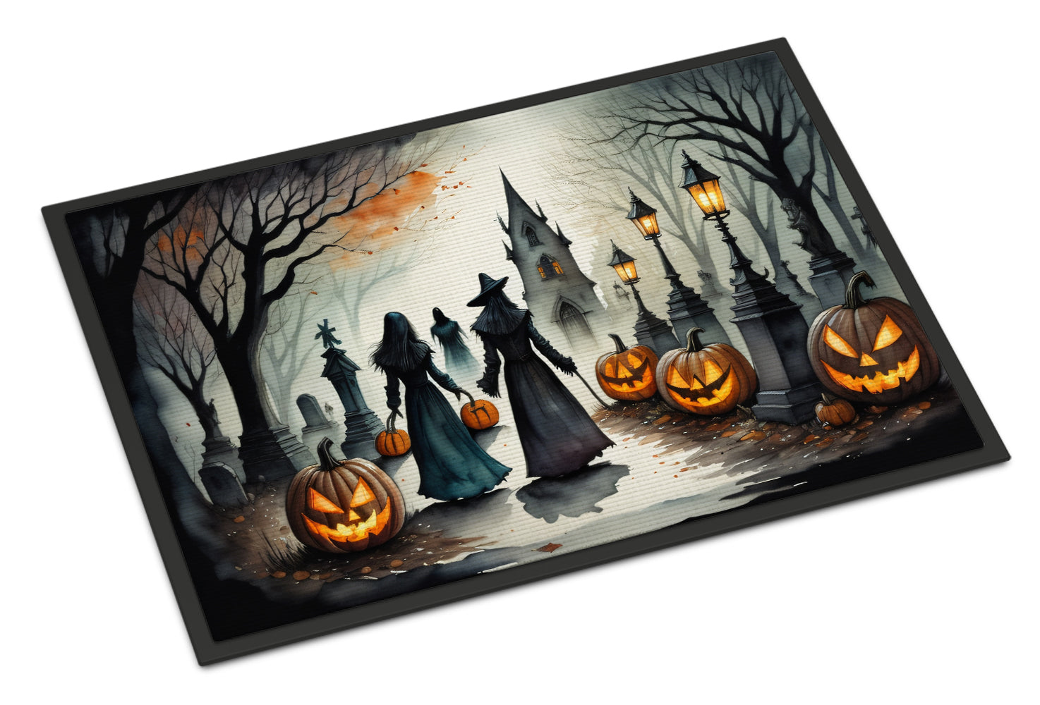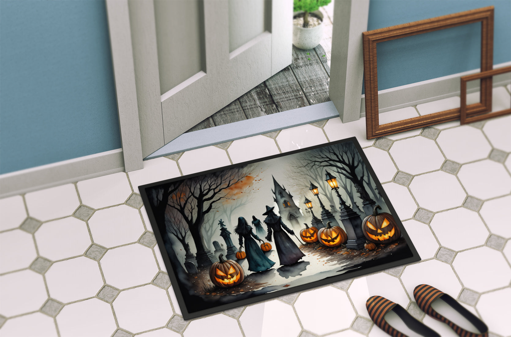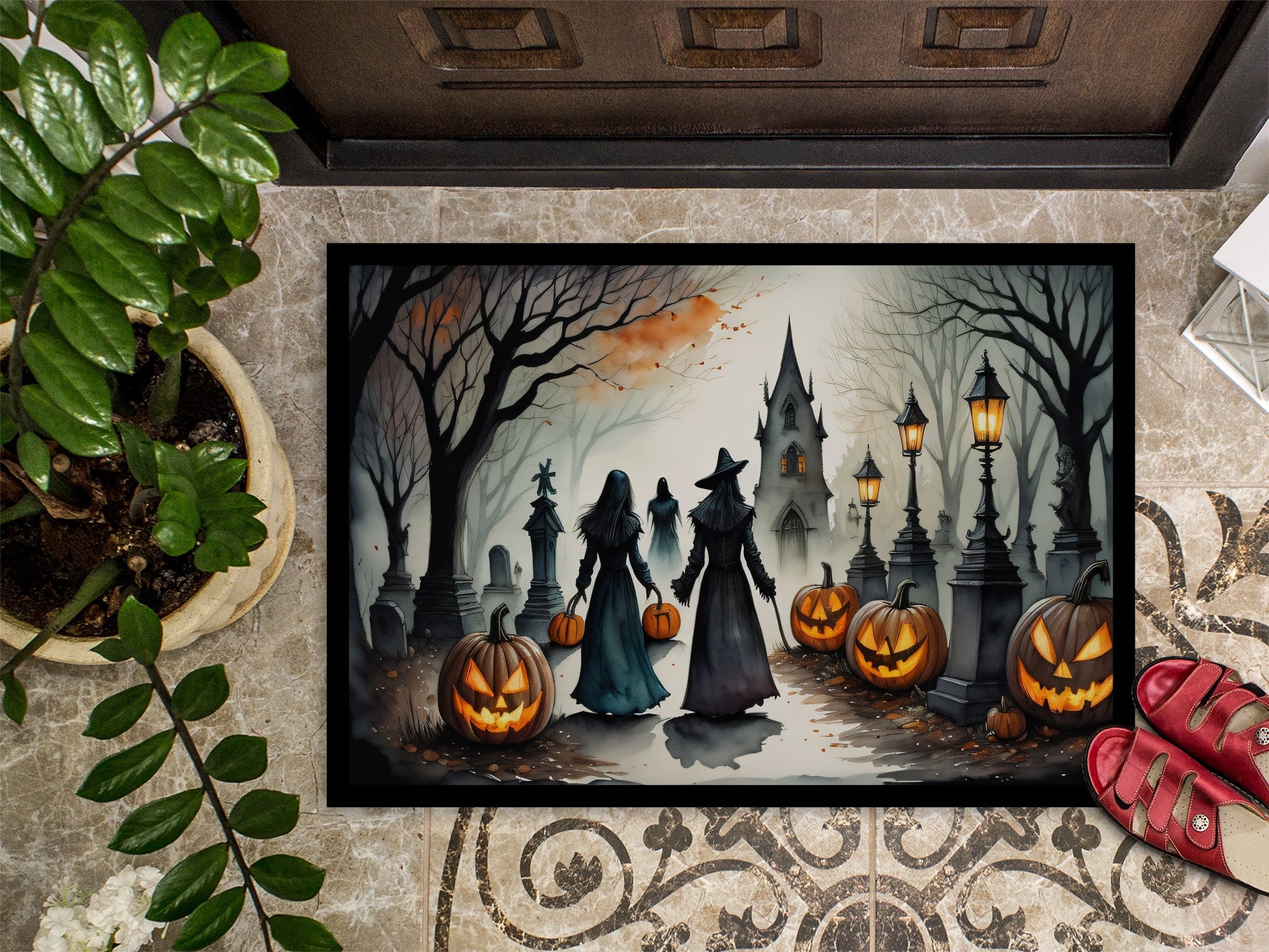 Celebrate Halloween with this Halloween Doormat. Welcome your guests in style with our Artwork Door Mat, designed to withstand almost any weather condition. This mat, measuring approximately 18 by 27 inches, is held together by durable black binding tape. Its top layer, composed of polyester felt, is dyed with the eye-catching image you see on the mat. A few layers below provide the mat with stability, while its rubber bottom is stamped to help prevent slipping and ensures safety. Our mat works wonderfully as both an indoor or outdoor door mat. For cleaning, simply hose it off with water or use a power washer - no need for any cleaner that produces suds. Avoid scrubbing with a brush, instead, opt for the vacuum on floor setting. Designed manufactured and printed in the USA, this mat is a perfect addition to your porch, outdoor kitchen, entryway, or any indoor space. Its unique design makes it a charming decorative rug that greets your guests and adds a stylish touch to your home decor.