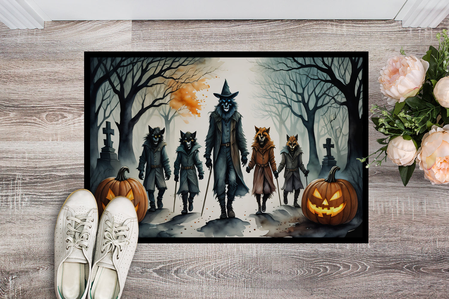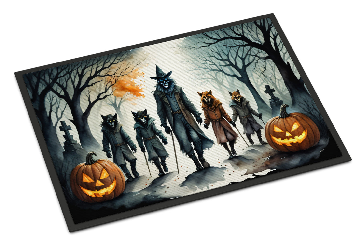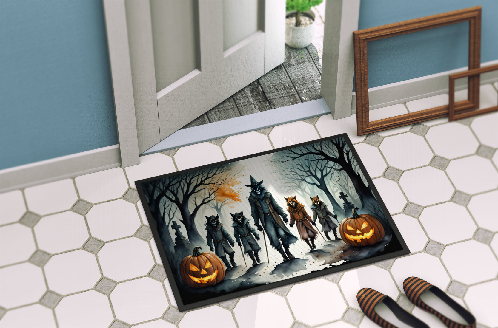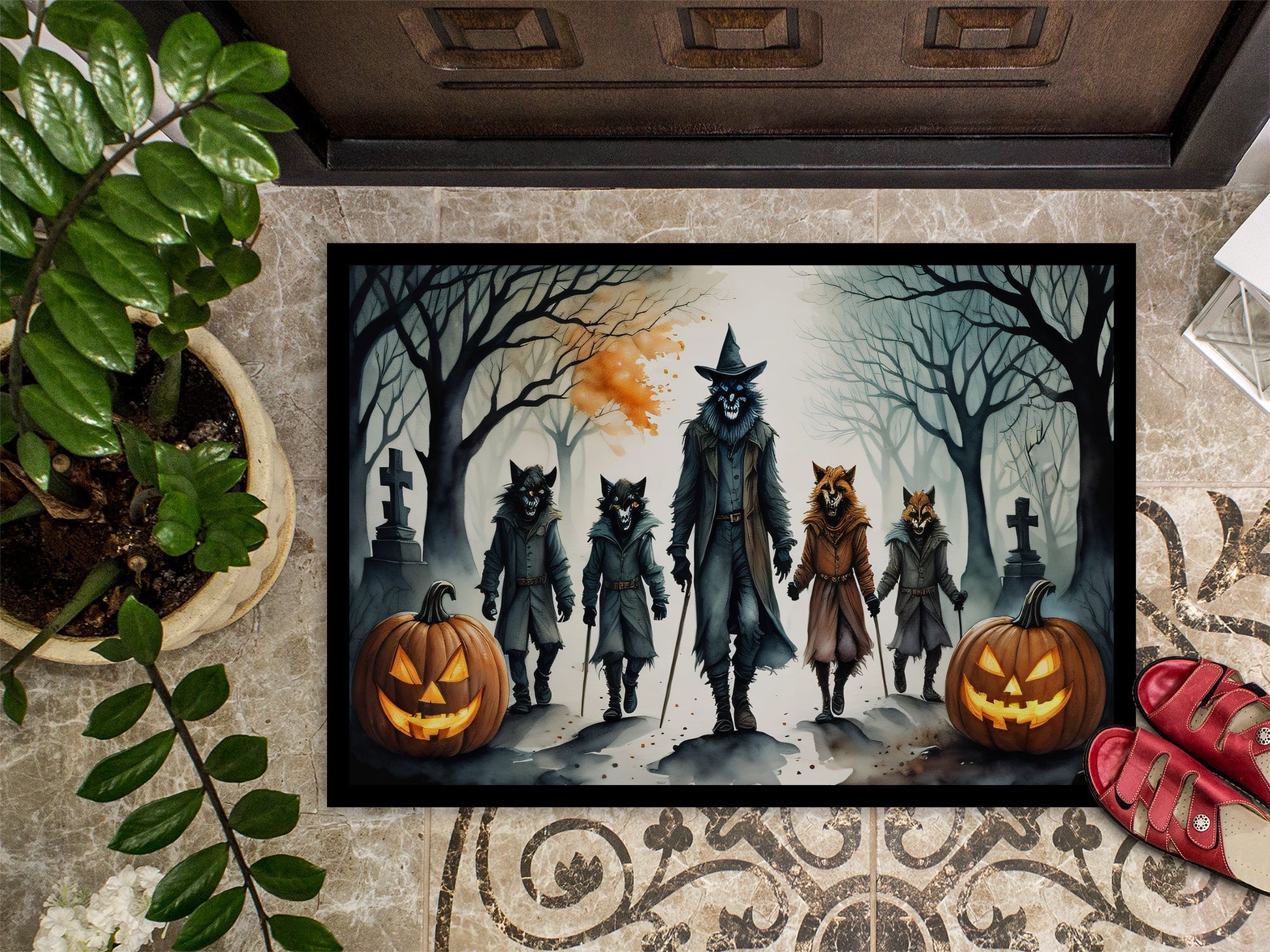 Celebrate Halloween with this Halloween Doormat. Welcome your guests in style with our Artwork Door Mat, designed to withstand almost any weather condition. This mat, measuring approximately 18 by 27 inches, is held together by durable black binding tape. Its top layer, composed of polyester felt, is dyed with the eye-catching image you see on the mat. A few layers below provide the mat with stability, while its rubber bottom is stamped to help prevent slipping and ensures safety. Our mat works wonderfully as both an indoor or outdoor door mat. For cleaning, simply hose it off with water or use a power washer - no need for any cleaner that produces suds. Avoid scrubbing with a brush, instead, opt for the vacuum on floor setting. Designed manufactured and printed in the USA, this mat is a perfect addition to your porch, outdoor kitchen, entryway, or any indoor space. Its unique design makes it a charming decorative rug that greets your guests and adds a stylish touch to your home decor.