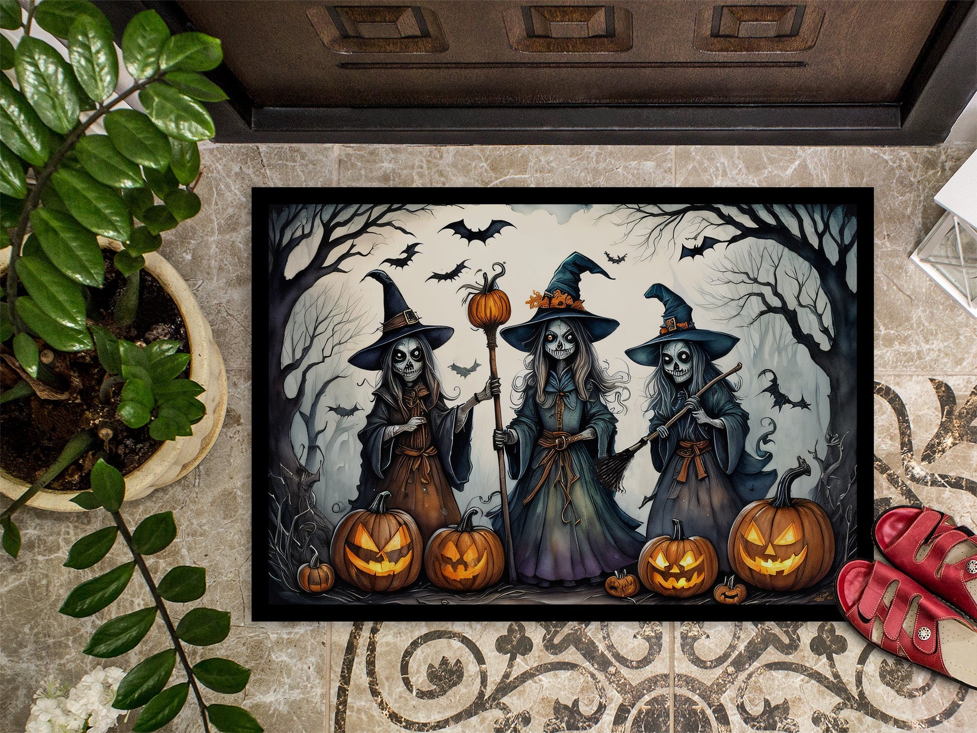 Celebrate Halloween with this Halloween Doormat. Welcome your guests in style with our Artwork Door Mat, designed to withstand almost any weather condition. This mat, measuring approximately 18 by 27 inches, is held together by durable black binding tape. Its top layer, composed of polyester felt, is dyed with the eye-catching image you see on the mat. A few layers below provide the mat with stability, while its rubber bottom is stamped to help prevent slipping and ensures safety. Our mat works wonderfully as both an indoor or outdoor door mat. For cleaning, simply hose it off with water or use a power washer - no need for any cleaner that produces suds. Avoid scrubbing with a brush, instead, opt for the vacuum on floor setting. Designed manufactured and printed in the USA, this mat is a perfect addition to your porch, outdoor kitchen, entryway, or any indoor space. Its unique design makes it a charming decorative rug that greets your guests and adds a stylish touch to your home decor.